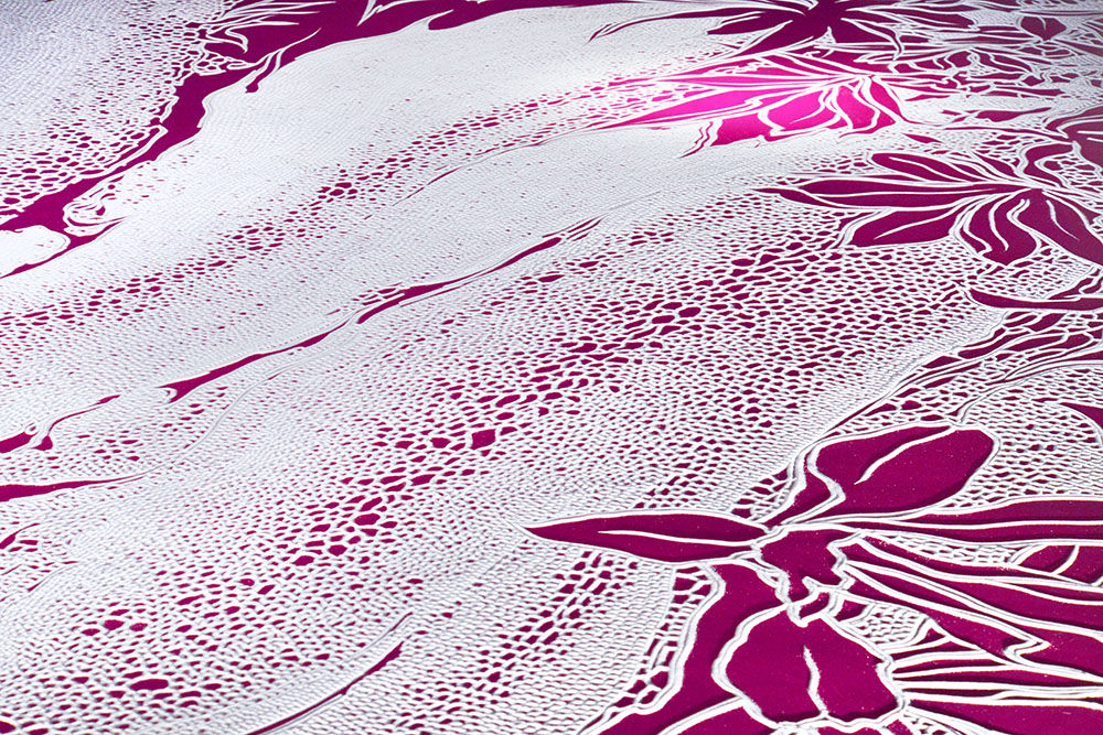 2018年、私は元ちゃんハウスで紫色の木蓮を塩で描きました。乳がんで亡くなった妻との記憶を、思い出の花に託した作品です。