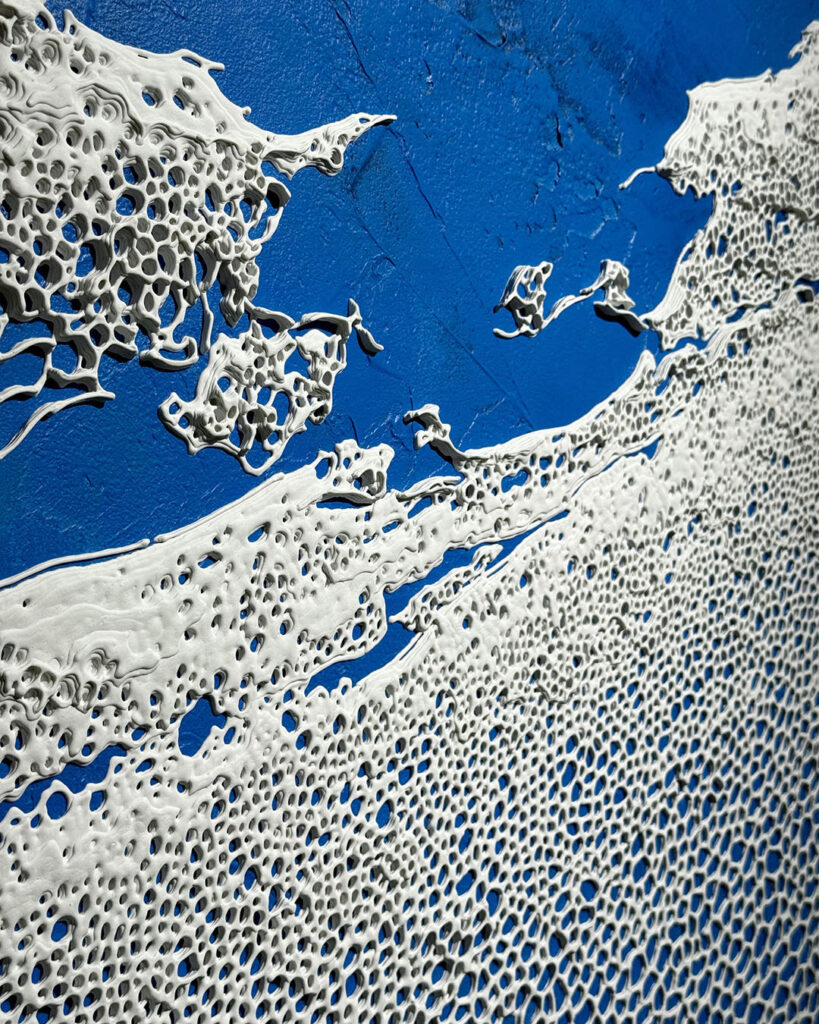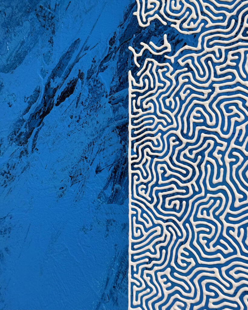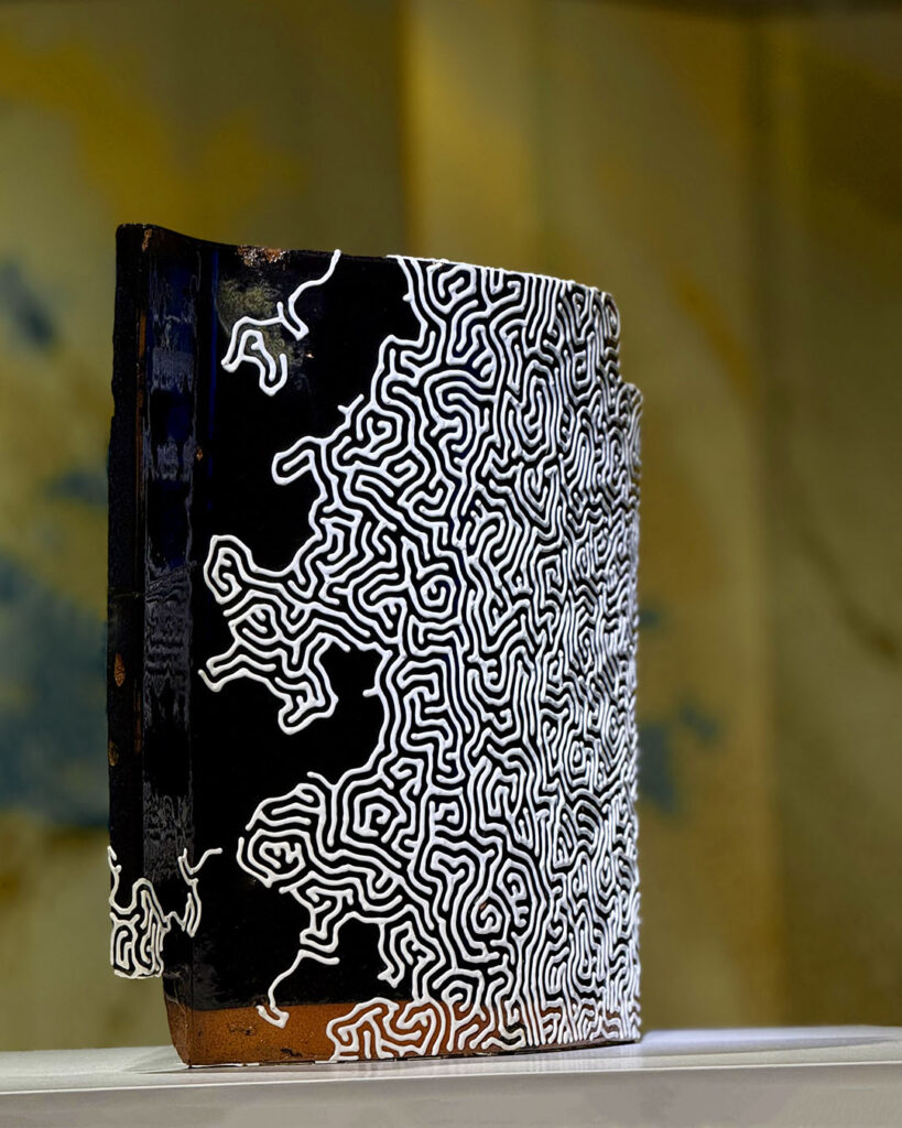 本展で展示する迷宮や渦巻きは、古来、再生や循環を象徴する形として世界各地で用いられてきました。渦巻きは縄文土器にも見られ、自然の循環や生命力を想起させる形です。描線を何層にも重ねた「時の積層」は、隆起した海岸線をヒントに、震災後にはじめた新しいシリーズです。さらに今回は「瓦バンク」の協力を得て、倒壊家屋から救出された能登瓦を用いた作品も展示しました。
