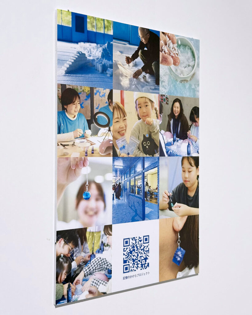 能登半島地震で、奥能登国際芸術祭の出品作《記憶への回廊》は倒壊し、7トンの塩で築いた塩の階段は瓦礫になりました。崩れた光景を前に、ただ「元に戻す/戻さない」を決めるのではなく、能登で暮らし続ける人々の時間に寄り添える形は何かと考えました。そこで私は、作品の塩をレジン樹脂に封じ、参加者が自分の手でアクセサリーをつくり、その小さな光を持ち帰る―失われたものを別の形で再生するため、ワークショップ「記憶のかけらプロジェクト」を始めました。本展の会期中にも石川県で開催し、思い出を封じた小さなかけらが生まれています。