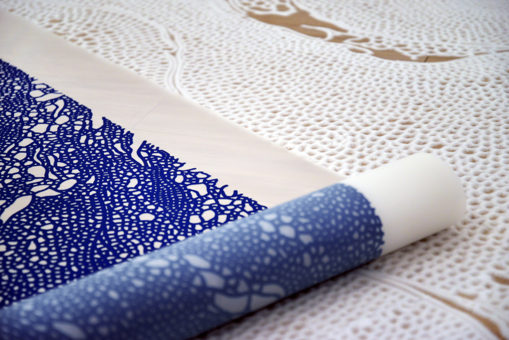 A work involving lines drawn with gouache using a fine tip brush on a translucent, thin film similar to tracing paper. These can be exhibited in a variety of ways, such as being hung from the ceiling like a banner or draped across the floor.