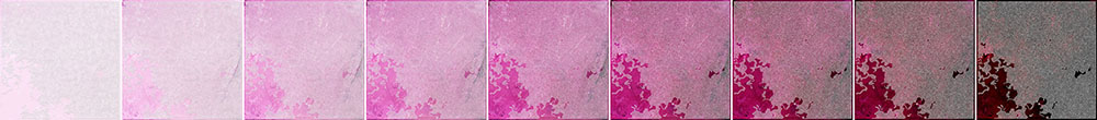 9枚の画像は、それぞれ異なる時間の「層」を象徴しています。深い紫は濃密な記憶を、淡い色は遠くほどけていく記憶をイメージしており、それぞれが独立作品でありながら、全体でひとつの時間の連なりを描くよう構成しています。