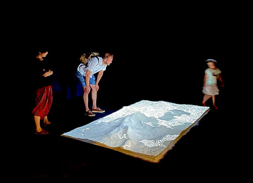 床一面に塩で地形のようなスクリーンを作り、その上にデジタルドローイング映像を投影した作品です。ここに掲載した画像や動画は、その会場風景で、塩のスクリーンを囲む鑑賞者の姿や、投影されたドローイングのクローズアップを見ることができます。暗い空間のなかで、観客は作品のまわりをゆっくり歩き、ときに身を屈めながら、光と線のわずかな変化を自分自身の記憶と重ねるように見つめていました。